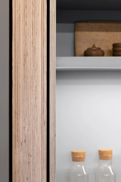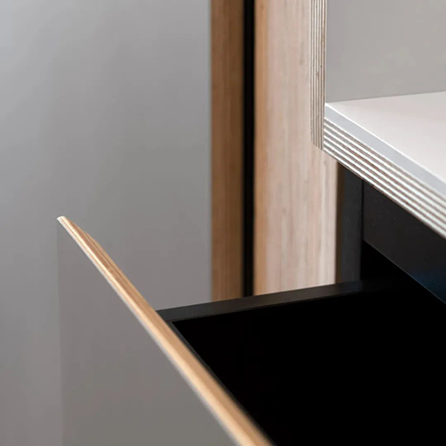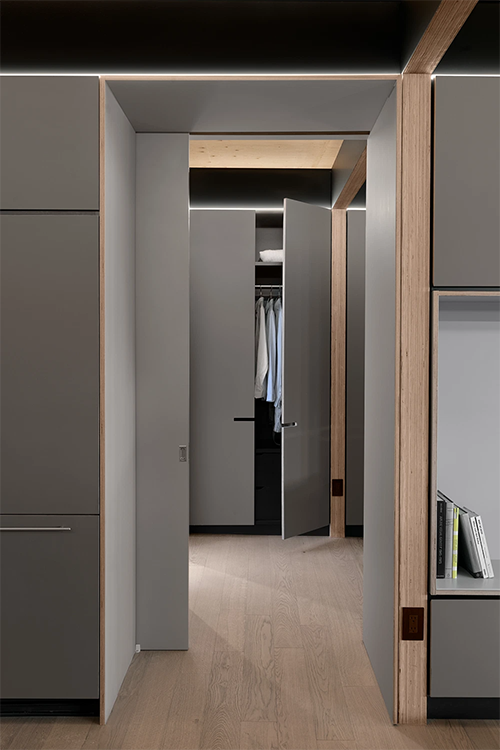 室內給人第一眼的感覺是非常的規整,物件各司其職。不是極簡主義的疏冷干凈,而是居家卻又井井有條。在這個空間中亦沒有什么很明顯的主觀風格傾向,如果一定要說有什么傾向,可能是墻上布里奇特·路易斯·萊利(Bridget Riley) 的歐普藝術畫作《Red with Red》比較顯眼,但它也僅僅指向了一種當代性,甚至是作為整屋理性的互補而非指引。就像 Siegel 表達的那樣,它是一個非常高質量的日常家具的集合。 天花與地板均用了木材,天花的木材呈條紋略淺的顏色,以示上下區分。淺暖木色、淺米灰色、白色搭配為主調,黑色為次色,整體溫暖理性。一體式櫥柜代替了一整面墻,盥洗臺、烤箱、蒸箱、操作臺一應俱全,并做了很多收納分隔。