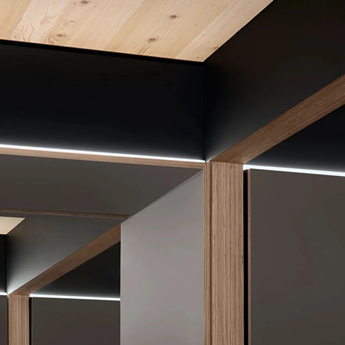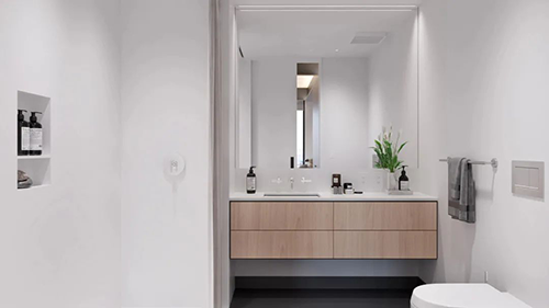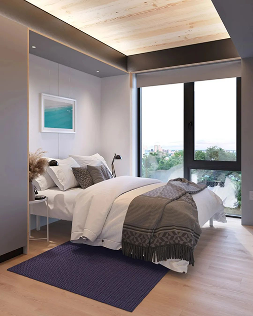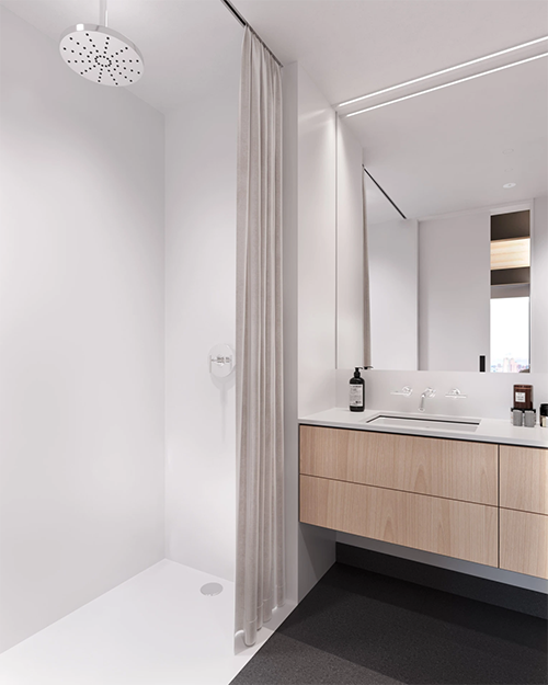 如果在較為寬敞的起居室不明顯,那么在臥室中比較明顯的一點是層高,它比普通住宅要高一些,這是項目的特點之一,天花板高且無穿透,以實現更好的隔音效果,可調節的照明系統藏在其中。在 Siegel 看來,充足的日光、新鮮空氣、自然材料、較高層高的空間以及被郁郁蔥蔥的綠色植物覆蓋的外墻是高質量公寓樓必不可少的條件。