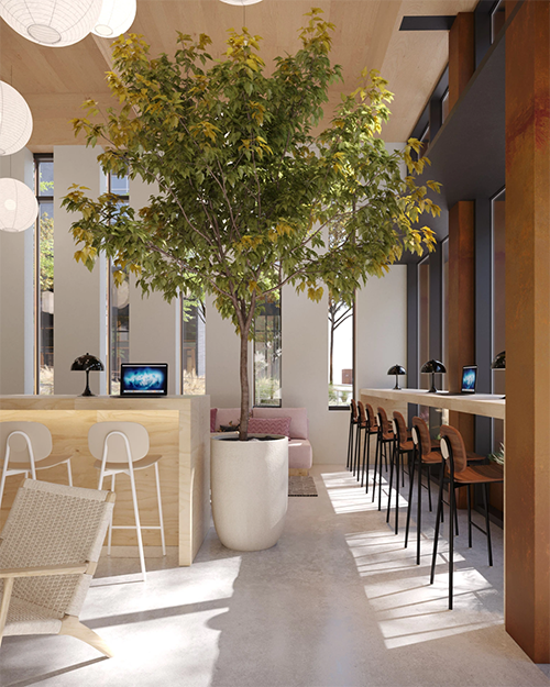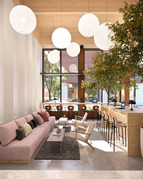 CLT交叉層壓木材(左)VS Glulam 膠合層壓木材 (右) 裙樓內部是一個社區空間,落地窗戶和開闊的層高讓空間非常明亮。就像 Juno 本身的定位,這兒沒有什么奢侈的感覺,有的是高質量感的日常生活。 有一種將星巴克搬進蘋果商店或者在蘋果喝咖啡的有趣交融。交流、輕松是這個空間的關鍵詞。吧臺、沙發、島臺擁有適宜的尺度,木材被大量使用在天花和家具上。
