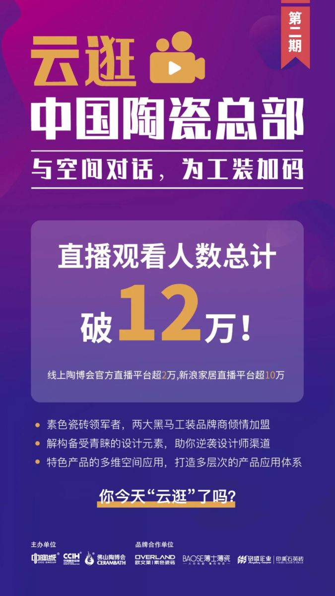 5月29日,由陶瓷總部主辦,聯合設計名家蔡祝源以及瓦莎齊、薄士薄瓷、歐文萊三大品牌共同舉辦的“云逛陶瓷總部二期—與空間對話,為工裝加碼”在陶瓷總部舉行,直播持續近2小時,截止17:00累計觀看人數達120000人。