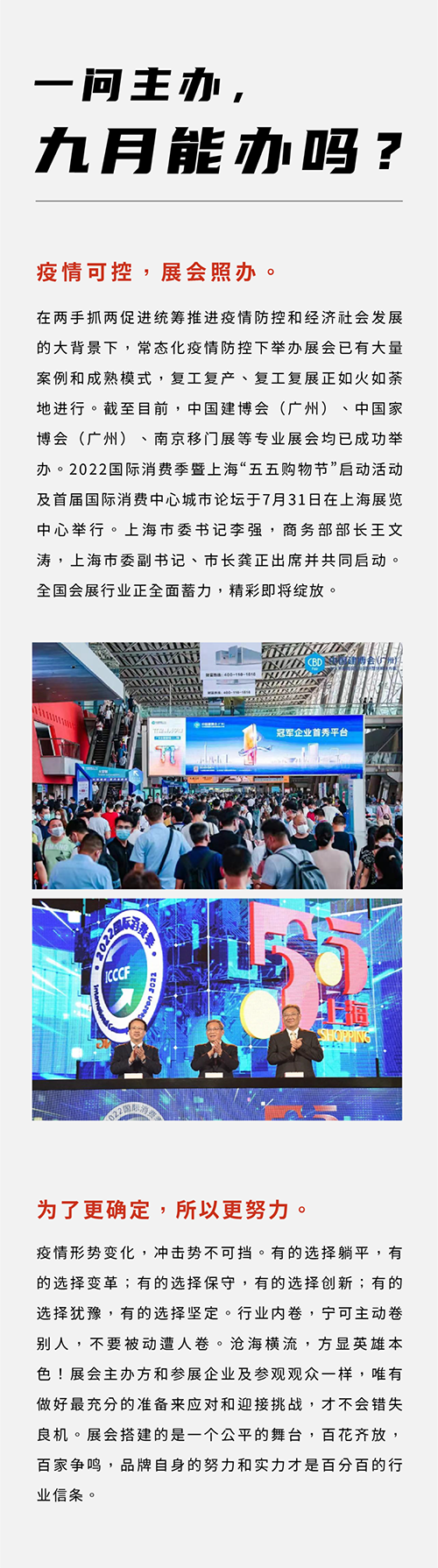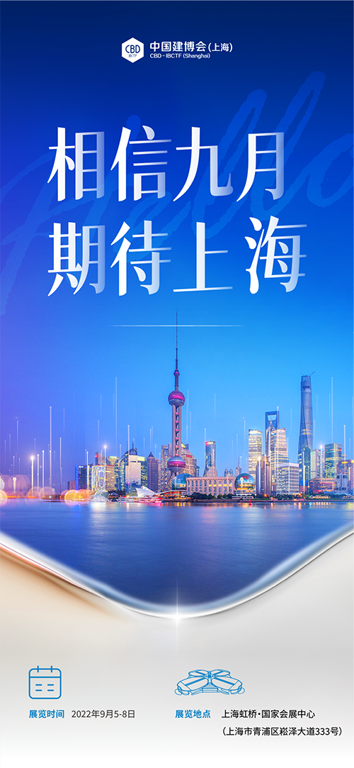 九月虹橋 · 大有不同 大有可期 大有可為 大展身手 有流量、有生意 有細節、有溫度 初心從未改變 服務不斷超越 第50屆中國家博會(上海) 2022中國建博會(上海) 歡迎您回家 9月5-8日,上海虹橋國家會展中心 不見不散 ▼8月5日 《下一刻·向未來》