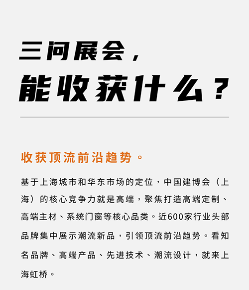 大流量 本屆中國家博會(上海)與中國建博會(上海)雙展同期,傳播力度更廣,渠道互通互聯,覆蓋經銷商、設計師、房企裝企、賣場等群體,線上線下并行,鏈接多方優質資源,為品牌造勢引流。預計本屆展會到會觀眾將達200000人,助力品牌一站式傳播招商。