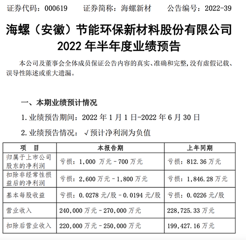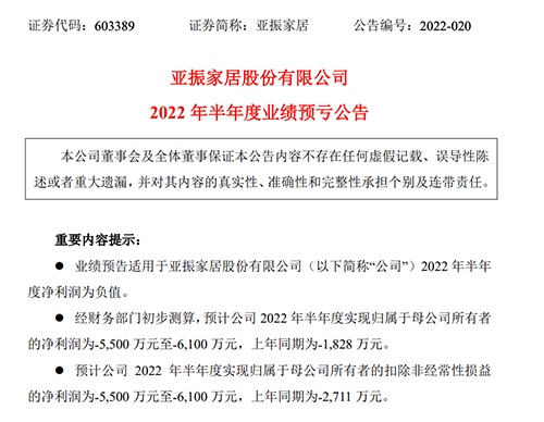 7月14日,海螺新材(000619.SZ)發布2022年半年度業績預告稱,預計上半年公司歸屬于上市公司股東凈虧損700萬元至1000萬元,預計扣除非經常性損益后虧損1800萬元至2600萬元。營業收入24億元-27億元,上年同期為22.87億元。 10亞振家居