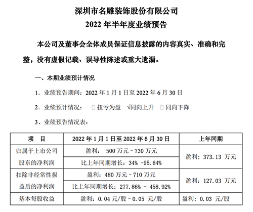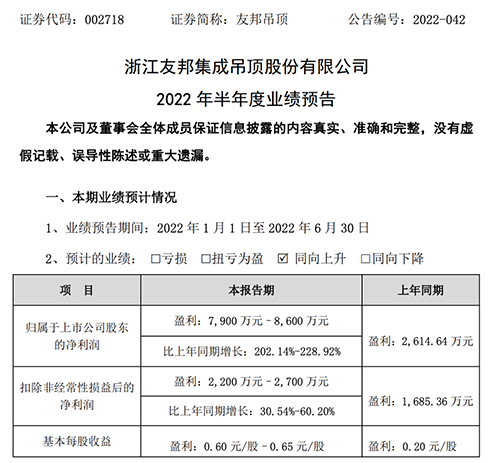 7月14日晚間,名雕股份(002830.SZ)發布業績預告,預計2022年上半年歸屬于上市公司股東的凈利潤500萬元~730萬元,同比增長34%~95.64%;基本每股收益0.04元~0.05元。 07友邦吊頂
