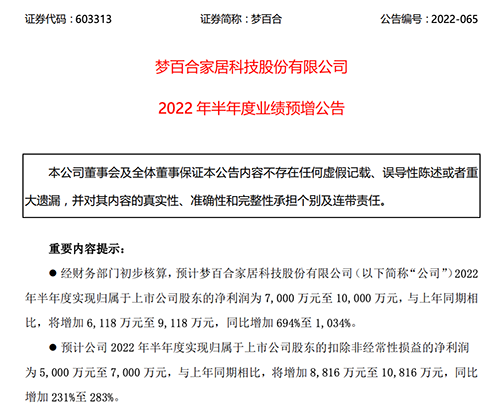 7月14日,夢百合(603313.SH)發布業績預增公告稱,預計2022年半年度實現歸屬于上市公司股東的凈利潤為7000萬元至1億元,同比增加694%至1034%。歸屬于上市公司股東的扣除非經常性損益的凈利潤為5000萬元至7000萬元,同比增加231%至283%。 13愛麗家居