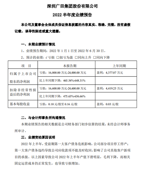 19廣田集團 而廣田集團則表示其2022年上半年利潤虧損,主要是因為受前期第一大客戶(恒大)債務危機影響,公司部分項目停工停產;第一大客戶債務違約導致公司應收款項不能及時收回,影響了公司其他客戶新項目的承接。這些因素導致其2022年上半年產值下滑明顯,毛利下降,而相關固定運營成本仍正常發生,也導致虧損增加。