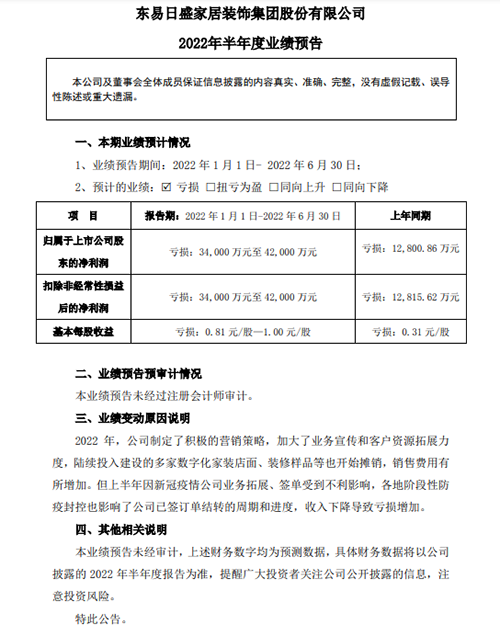 今年上半年,不少企業由于疫情反彈,其業務拓展、貨物運輸、零售經營等都受到影響。除此之外,企業自身運營策略、原材料成本增加等疊加因素,使東易日盛、寶鷹股份這兩家企業的營業收入、毛利率下降,導致虧損增加。 東易日盛預計今年上半年虧損3.4億至4.2億,其表示是因為2022年,公司制定了積極的營銷策略,加大了業務宣傳和客戶資源拓展力度,陸續投入建設的多家數字化家裝店面、裝修樣品等也開始攤銷,銷售費用有所增加。但上半年因新冠疫情公司業務拓展、簽單受到不利影響,各地階段性防疫封控也影響了公司已簽訂單結轉的周期和進度,收入下降導致虧損增加。