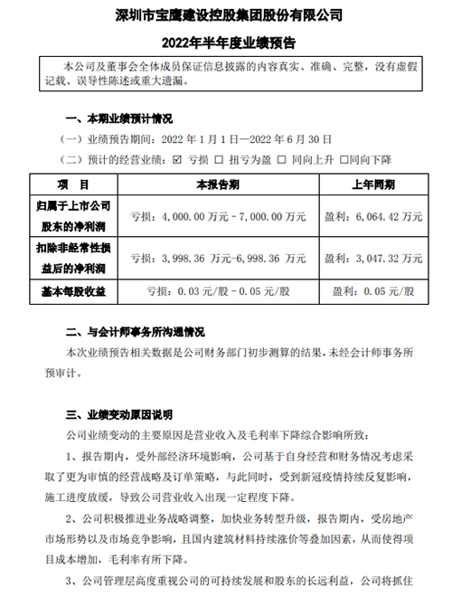 21寶鷹股份 寶鷹股份表示,公司業績變動的主要原因是營業收入及毛利率下降綜合影響所致。報告期內,受外部經濟環境影響,寶鷹股份基于自身經營和財務情況考慮采取了更為審慎的經營戰略及訂單策略,與此同時,受到新冠疫情持續反復影響, 施工進度放緩,導致公司營業收入出現一定程度下降。此外,公司受房地產市場形勢以及市場競爭影響,且國內建筑材料持續漲價等疊加因素,從而使得項目成本增加,毛利率有所下降。
