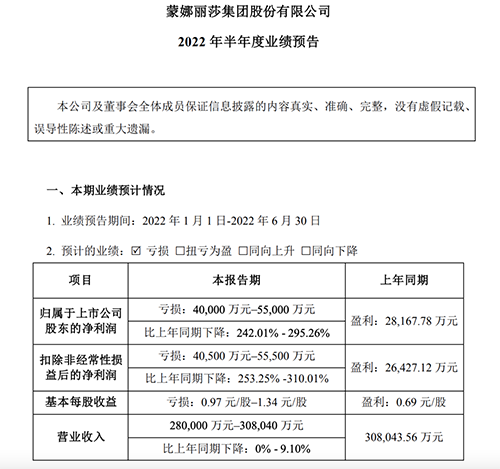 蒙娜麗莎(002918.SZ)7月14日晚間發布業績預告,預計2022年上半年歸屬于上市公司股東的凈利潤虧損4億元~5.5億元,由盈轉虧。基本每股收益虧損0.97元~1.34元。上年同期基本每股收益盈利0.69元。 02帝歐家居