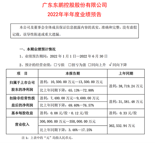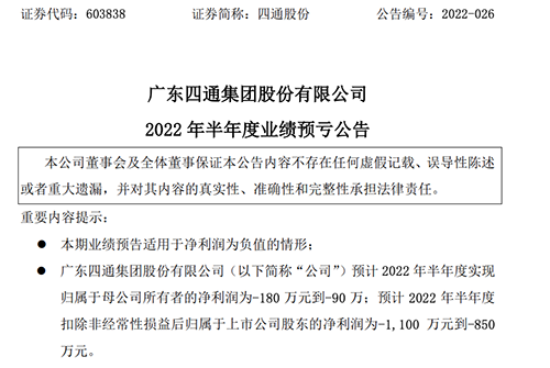 東鵬控股(003012.SZ)發布2022年半年度業績預告,預計營業收入30億元-35億元,同比下降3.46%—17.25%。歸屬于上市公司股東的凈利潤1.05億元-1.35億元,同比下降65.13%—72.88%。扣除非經常性損益后的凈利潤7,400.00萬元—9,600.00萬元,同比下降69.60%—76.57%。基本每股收益0.08元/股–0.12元/股。 04四通股份