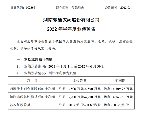 夢潔股份(002397.SZ)7月14日晚間發布業績預告,預計2022年上半年歸屬于上市公司股東的凈利潤虧損3500萬元~4500萬元,由盈轉虧。基本每股收益虧損0.05元~0.06元。 15德爾股份