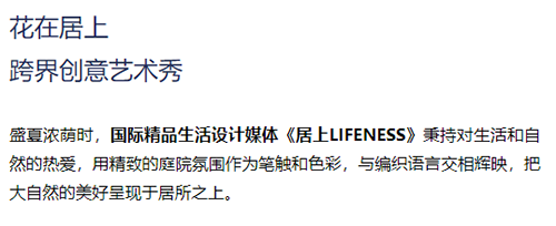 ● 創立于2018年的花在Flo-Flos,追求綠色、健康、環保的理念,并與藝術家跨界合作,首創提出“凍齡花”概念,打造國內獨一無二的花藝設計品牌。品牌致力于改變國人傳統花藝概念,讓“花”與“藝”相結合,展現視覺盛宴的同時,打造“花在文化”,讓美麗長久留存。