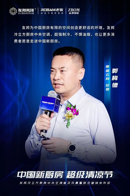 中國新廚房 超級清涼節聯合營銷啟動 在發布會的最后環節,來自奧維云網、友邦吊頂、志邦家居、老板電器、紅星美凱龍政務商場的各位嘉賓,共同登臺啟動了“中國新廚房 超級清涼節”的聯合營銷活動,三大品牌強強聯手,共筑理想廚房生活。從用戶使用場景和需求切入,致力為廣大消費者、為中國廚房升級提供更多選擇。