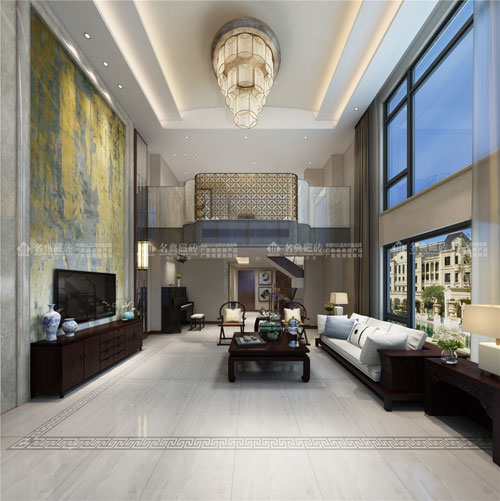 空間借景最簡單的方式莫過于借助自然景色,感受春夏秋冬,靜享四季輪換。600x1200大規格瓷拋磚搭配中式回形紋,清淡勾勒出絲絲風,又不搶奪了屋外映入的風景。