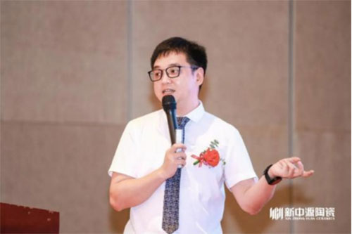 新中源陶瓷營銷總經理張磊詳細講述了新中源陶瓷產品體系結構的調整,明確表示750x1500“素SU”質感系瓷磚將是大力推廣的常青款明星產品。并從五大維度宣講了品牌的戰略布局。
