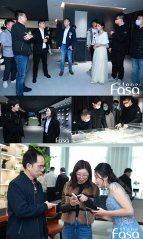 開業禮上,法薩經營總裁丁國興講述石英石材料屬性以及行業局限性,如體量小、研發弱、認知度低、場景不彰顯等,進而講述作為行業出口第一的品牌,法薩是如何在開發創新、應用突破等發力,打造石英石國民品牌,引領行業潮流。