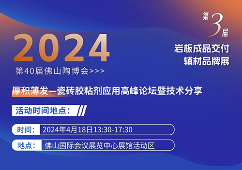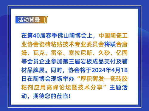 4月18日下午,在第40屆春季陶博會上,中國陶瓷工業協會瓷磚粘貼技術專業委員會將聯合唐姆、瓦克、雷帝、塞拉尼斯、久砂、億固等會員企業參加第三屆巖板成品交付及輔材品牌展。同時,協會將于在陶博會現場舉辦“猴急“厚積薄發——瓷磚膠粘劑應用高峰論壇暨技術分享”主題活動在(華夏展館)隆重舉行。