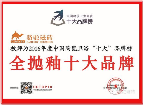 4月9日下午,2016首屆家居建材高峰論壇暨“陶瓷百強”品牌評測成果發布會在北京大學榮耀登場,駱駝磁磚一舉榮膺2016年度“全拋釉十大品牌”和“全國消費者滿意品牌”兩獎,再添殊榮。