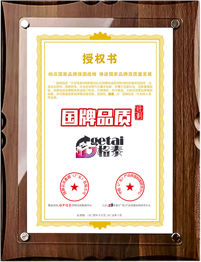 “國牌品質獎”作為品質權威大獎,含金量極高,榮獲該獎的品牌,無論從品牌影響力、產品設計,還是產品質量和科技創新,都代表了行業的高水準。格泰GETAI辦公家具擁有德國、意大利進口的先進生產線以及業務過硬實力與強大的研發技術人才,能夠把握國內外家具的流行趨勢。主要生產實木油漆家具、板式家具、軟體沙發椅子、新白亮光家具、酒店家具、飯堂家具、實驗室家具、宿舍家具、教學家具等。公司已通過ISO9001國際質量體系認證、ISO14001環境體系認證、ISOHSMS18001職業健康安全管理體系認證以及中國環保產品認證,同時獲得高新技術企業、守合同重信用企業和AAA誠信單位稱號。