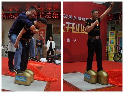 湘鄉大唐合盛瓷磚邀請了奧運會火炬手、世界吉尼斯記錄保持者中華鐵鞋王張正輝親臨現場,為廣大業主奉獻一場世界級的表演“鐵鞋踏磚”。其腳蹬400多斤重的鐵鞋于大唐合盛瓷磚的產品上來回踩踏、行走,只見舞臺輕晃,大唐合盛瓷磚產品卻完好如初。業主們見證了大唐合盛瓷磚的產品品質后,贊不絕口,爭先恐后地下定。