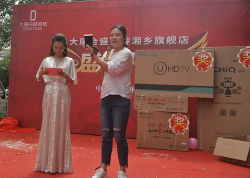 針對本次開業,湘鄉大唐合盛瓷磚聯合廠家隆重推出多個爆款特惠套餐,工廠直供,直接從產品和價格上給予消費者最大支持。更有點贊送黃金、下定抓現金、買一贈一、豪華家電百分百中獎等多項購磚鉅惠,讓廣大業主朋友享受了一場瘋狂的購磚盛會。