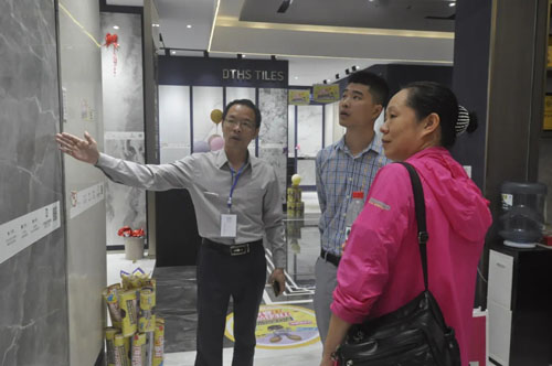 ▲導購向業主們介紹大唐合盛瓷磚產品