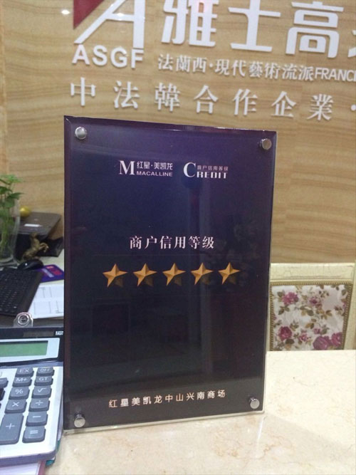 喜訊!7月11日,雅士高夫陶瓷在紅星美凱龍信用等級評選活動中,以優質的產品和服務贏得“五星級商戶”榮譽。據悉,紅星美凱龍商戶信用等級是指從顧客喜愛度、售后服務、質量管理、價格管理、履約行為、顧客評價等信用維度,通過對商戶在紅星美凱龍商場進營期間的信用行為,進行一定的信用數據累積并進行相應的評定分級,商戶信用等級由高到低分為:五星級商戶、四星級商戶、三星級商戶、二星級商戶、一星級商戶、以體現商戶信用的情況。