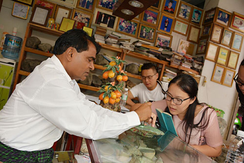 瑞麗17萬人口,做玉石生意的緬甸人4萬。作為瑞麗著名的緬甸商人是寶玉石協會副會長彭覺,47歲的彭覺畢業于仰光大學歷史系,參加了緬甸1988年的學生運動,后又與昂山素季一起參加政治運動。后來彭覺老師開始在推廣緬甸翡翠文化,經過30余年在瑞麗的打拼,在瑞麗已擁有3家翡翠店鋪。