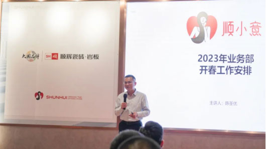 在本次開年內訓會上,順輝瓷磚·巖板常務副總經理陳圣優、順成陶瓷集團副總裁助理方輝平、家裝事業部總經理廖志平、市場部總監鄭建、客服部經理肖春枝、內務部經理梁潤玉先后對業務部、家裝事業部、市場部、客服部、內務部2023年工作重點及部門協作進行詳細講解,為新的一年部門間高效運轉奠定基礎。