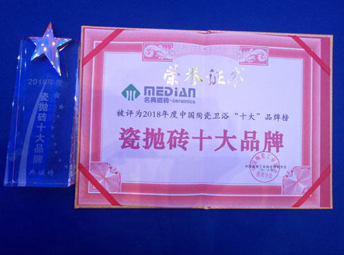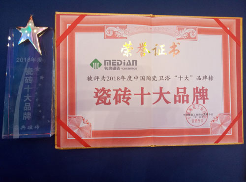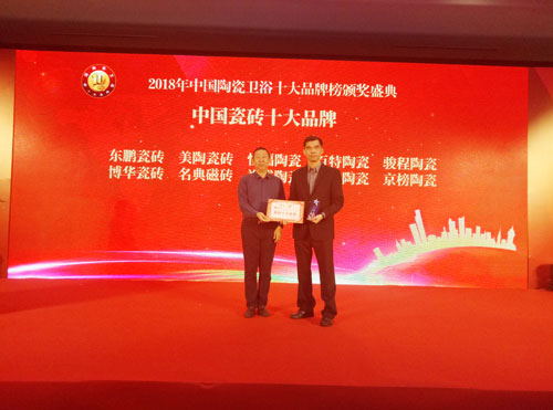 3月27日下午,由陶瓷工業協會營銷分會和陶瓷品牌網聯合舉辦的“2018陶瓷衛浴十大品牌榜”頒獎盛典在杭州國際展覽中心盛大舉行。行業專家、知名陶瓷衛浴企業高層代表齊聚一堂,共同見證年度楷模品牌的榮耀時刻。據了解,此次活動報名的企業近千家,名典磁磚脫穎而出,連獲“瓷磚十大品牌”、“瓷拋磚十大品牌”兩項大獎,這是實力與品牌競爭力的最佳證明。