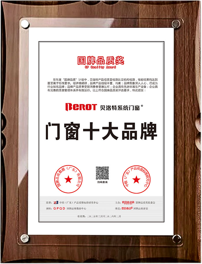 作為“國牌品質計劃”重要組成部分的“國牌品質獎”,是行業公認的全國品質權威大獎,專業度和權威性備受消費者和行業認可。貝洛特系統門窗憑借嚴苛的工藝標準、領先的技術創新及卓越的用戶體驗,榮獲“國牌品質獎”!標志著貝洛特系統門窗在門窗領域的綜合實力,獲得極大認可,彰顯“中國制造”的硬核品質。