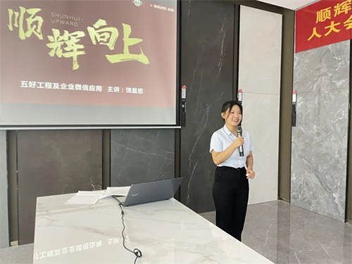 在渠道為王的今天,市場零售占比越來越低,為加強服務商們多元化渠道的了解與認知,聚力渠道建設,實現品牌提速發展。對此,順輝瓷磚?巖板金牌講師饒呈思還為在場的順輝精英們進行了《五好工程及企業微信》講解和實操培訓,為終端賦能。