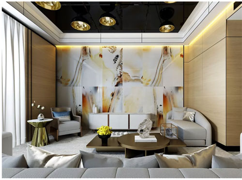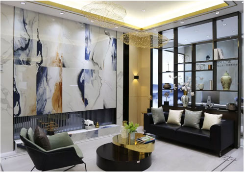 畫以自由想象、宏大意境取勝,名為【水墨丹青】更多是因為對國畫精神境界的繼承,弘揚意境之美、想象之巔,繪畫自然的大美之境。選取經典的丹、青、黑、白,濃墨素雅,恣意揮灑,將現代主義風格與柔美婉轉的古典風格巧妙融合,通過紋理的自由化來凸顯意境,或寧靜或深遠或酣暢或迷離,極地之遙,冰層之厚,深海之幽,寥寥幾筆勾勒、淡淡幾層渲染,即活現于磚面之上。