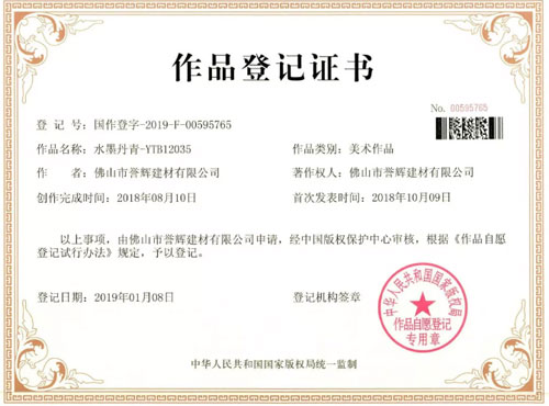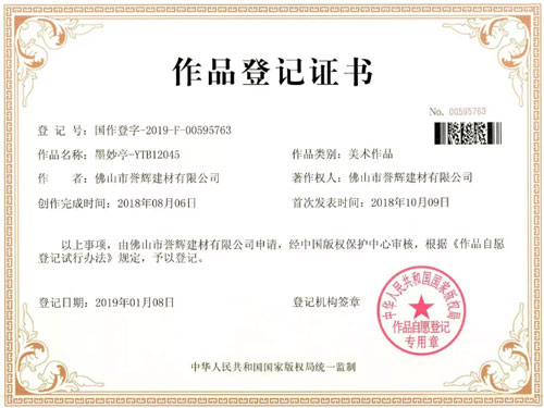 2019年伊始,譽輝手繪磚【墨妙亭】和【水墨丹青】經版權保護中心審核,正式予以登記,以原創版權保護的形式,真槍實彈宣告譽輝陶瓷自主研發戰略進入豐收階段,開啟原創品牌的主流認可之旅。