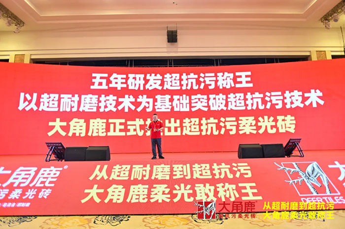 2024年10月17日,"從超耐磨到超抗污 大角鹿柔光敢稱王——大角鹿超抗污柔光磚發布會"在廣東佛山盛大召開。行業領導專家和廣東電視臺、南方日報、廣州日報、家居品牌網等50多家全國主流媒體與行業媒體以及600位大角鹿家人們歡聚一堂,100萬+建材家居人通過線上直播共同見證了大角鹿柔光磚抗污王正式面世。這不僅是大角鹿在開創領跑全球的超耐磨技術后的又一里程碑,更是對陶瓷行業傳統難題的一次顛覆性革新。