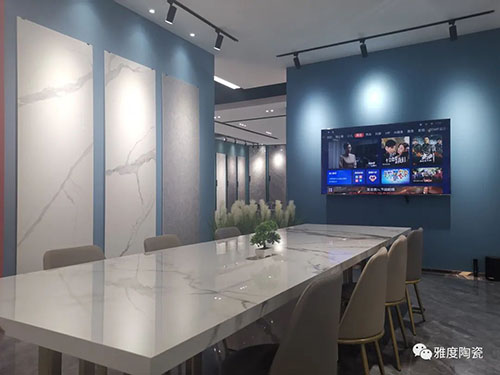 產品布局以全品類、全規格產品全線上陣,將雅度陶瓷時尚、活力的品牌文化,充分融入展廳舒適現代的設計風格。空間分為大板巖板、中板、連紋產品、基礎產品等不同風格展示區。