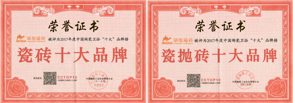 前言:品牌是一個企業的靈魂,優秀品牌的價值更是企業最重要的無形資產。駱駝磁磚憑借強大的產品實力及良好的品牌優勢,從眾多企業和品牌中脫穎而出,一舉囊括了“瓷磚十大品牌”、“瓷拋磚十大品牌”兩大極具價值獎項!