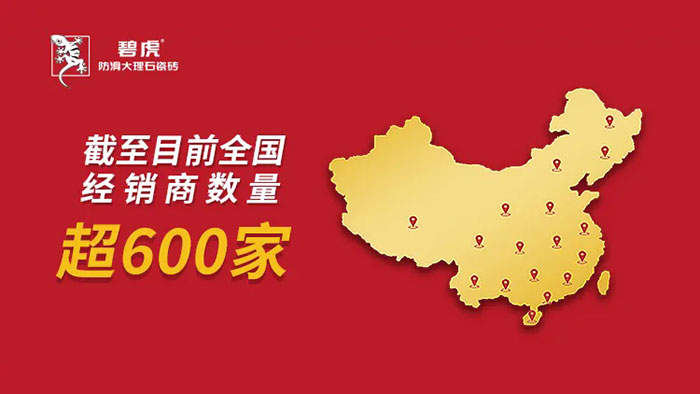 碧虎以創新卓越的超防滑核心技術,為碧虎瓷磚保駕護航,銷售網絡遍布全國各地,已有超600家經銷商,為千萬家庭提供高品質防滑大理石瓷磚。