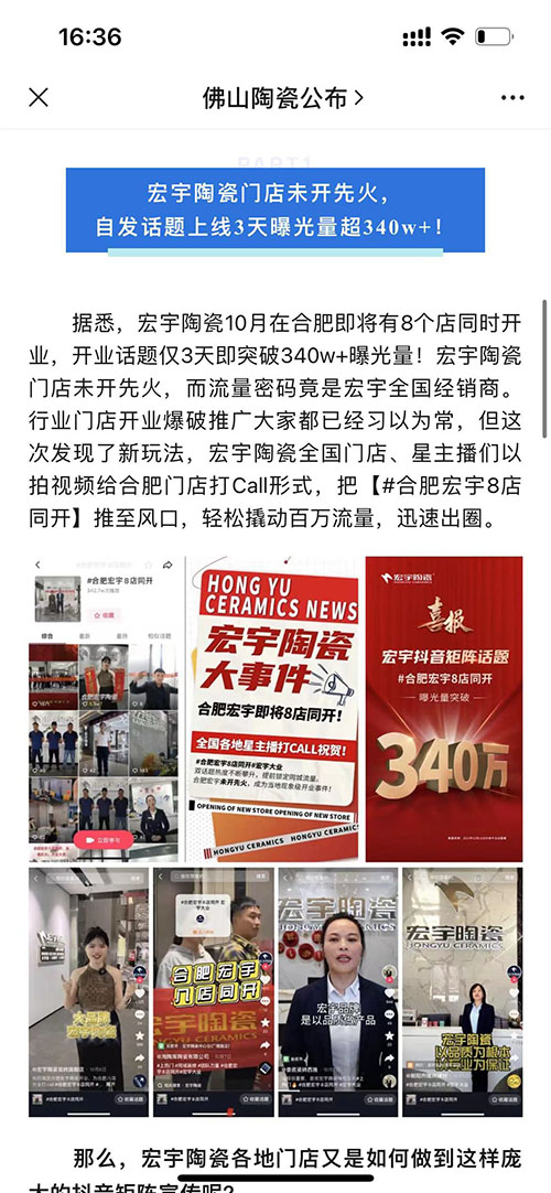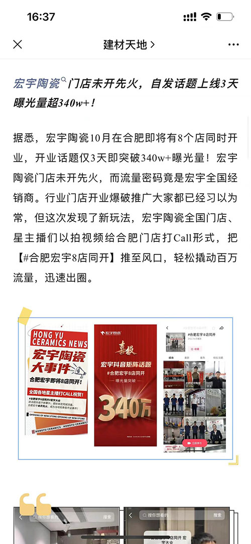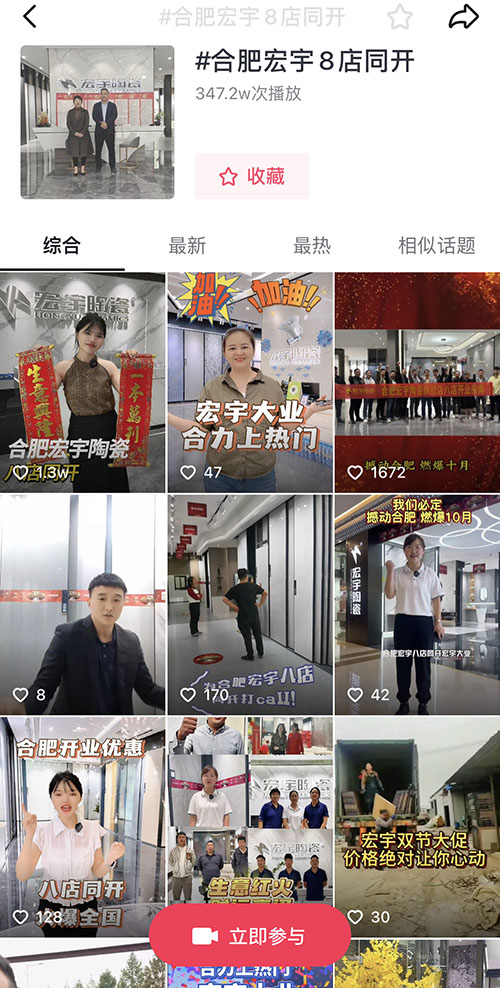 宏宇陶瓷全國門店、星主播們以短視頻方式為合肥八店同開打Call造勢,自發話題【#合肥宏宇8店同開】僅3天即突破340w+曝光量,自帶流量引爆開業熱度,通過密集曝光,緊抓客戶眼球,搶占潛在客戶的消費心智。