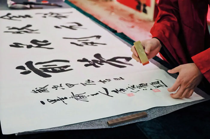 在狀元賜墨環節中,品牌特邀廣東省書法家協會會員、佛山市書法家協會理事一墨齋主人李俊濱親臨現場,即席揮毫寫下「金科狀元,名列前茅」,每一筆每一劃都充滿了力量和生命力,字里行間流露出金科品牌的活力與沖勁。