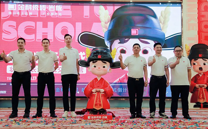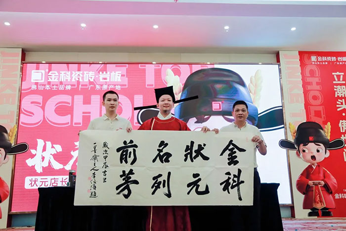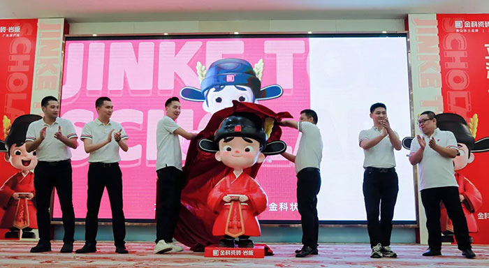 2024年6月18日,金科品牌公司高層領導齊聚一堂,共同為新IP「金科狀元」揭幕。隨著幕布緩緩揭開,「金科狀元」這一充滿活力和創新精神的卡通形象躍然眼前。它身穿采用粵繡而成的狀元袍、頭戴寓意“大賣”的稻棵冠翅造型的冠帽,既體現了金科瓷磚緊跟時代潮流的創新精神,也象征著品牌對于傳統文化的尊重與傳承。