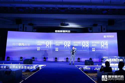 發布會上,利家福產品總監劉毅先生針對此次的新品進行講解。利家福引進全進口原創設計,率先帶來了2023年秋季新品[晶瓷]系列,在兼顧顏值的同時,也做到了超強性能,不止超耐磨,而且超防污,15°柔光細膩,更顯質感。