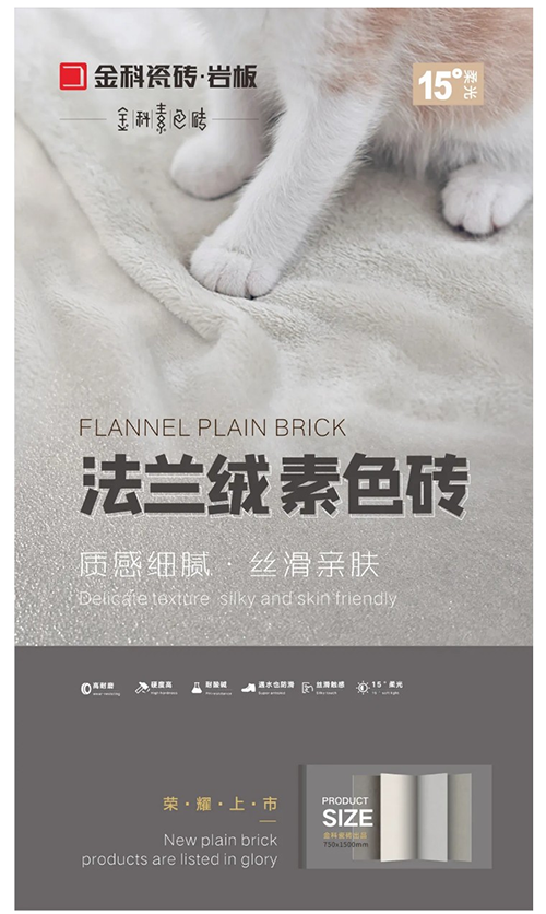 產品顏值是必須的,但是實用性能也是用戶需要考慮的哦。為了使素色磚在裝飾及物理性能更出色,金科瓷磚在原有的產品基礎上進行工藝升級,全新打造更具質感的“法蘭絨”素色磚,產品體驗感超乎你想象!