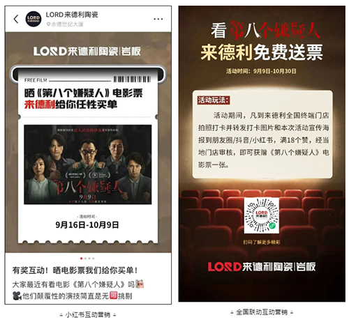借力本次電影《第八個嫌疑人》電影的熱映,來德利品牌開展了自上而下全國性贈票活動。總部在官網內容平臺,如小紅書、微信公眾平臺等品牌自媒體平臺發起活動,同時發動品牌經銷商借助近期金九銀十終端促銷旺季的契機,全面推動品牌造勢營銷!