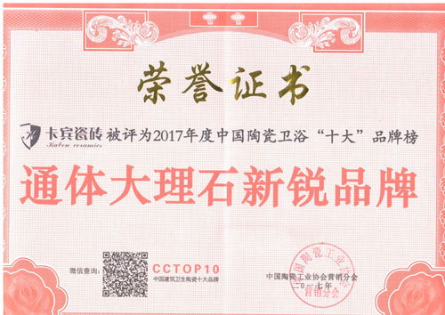 卡賓瓷磚憑借近年來在行業卓越的實力表現和創新的產品研發能力榮獲“通體大理石新銳品牌”的殊榮,用實力與榮譽向世人彰顯著卡賓瓷磚通體大理石的暢銷成果與品牌風范;全面提高了卡賓瓷磚在消費者中的知名度和美譽度。