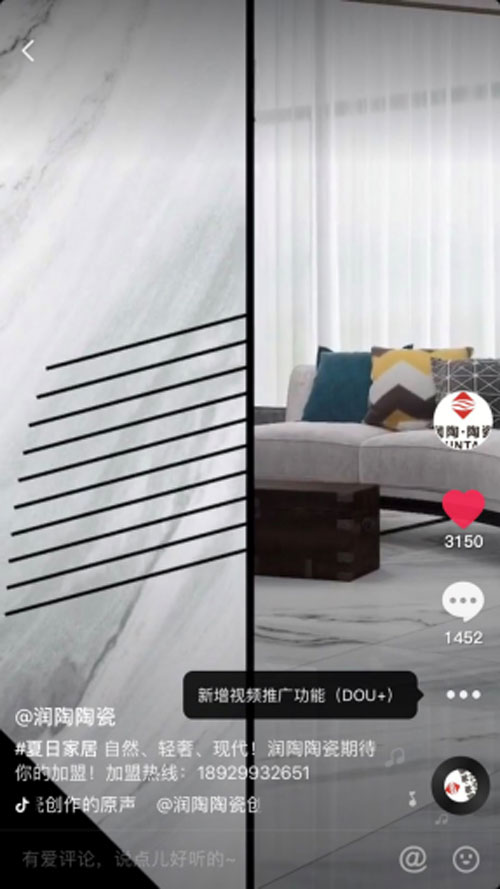 在與年輕精英一代的文化溝通中,潤陶陶瓷用短視頻、創意圖片等方式貼近消費者,用年輕精英一代的語言表達方式,與他們輕松的講故事,表達潤陶陶瓷對美好生活的憧憬,使得冷冰冰的商品更有情感,建立品牌與客戶間情感溝通的橋梁。