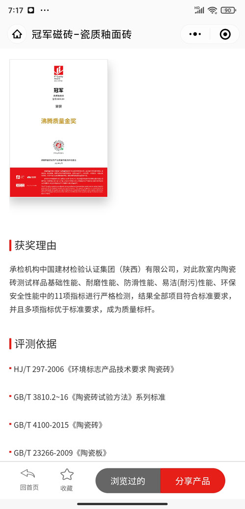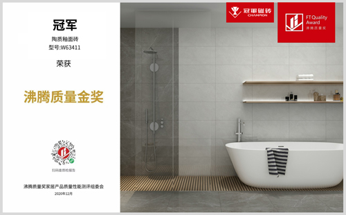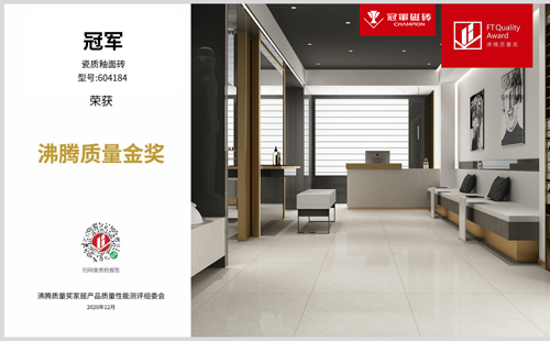 2020年度沸騰質量獎家居產品質量性能測評活動圓滿收官,冠軍磁磚兩項產品陶制釉面磚、瓷質釉面磚榮獲“沸騰質量金獎”榮譽。