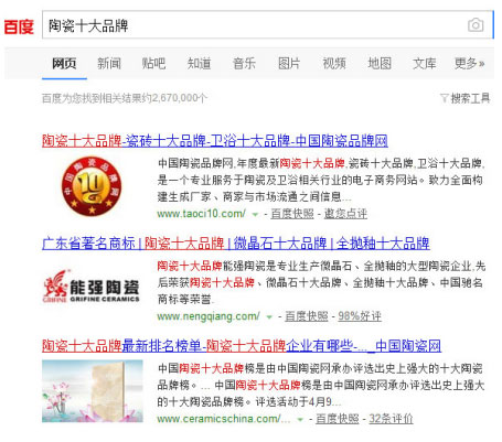百度搜索陶瓷十大品牌、瓷磚十大品牌、陶瓷一線品牌等熱門關鍵詞,榜單排名百度首頁,方便客戶終端搜索;