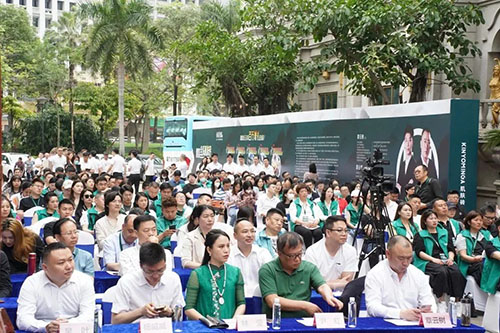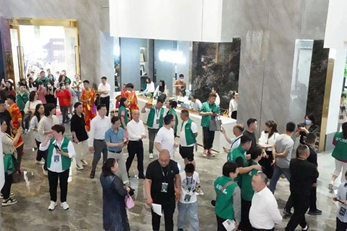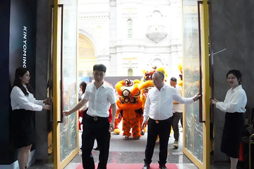 12位主禮嘉賓共同為金玉名家肌膚磚展廳剪彩,隨后章氏企業董事長章云樹、章氏企業董事總經理章云黨攜醒獅共同為全場嘉賓開門大吉,引領眾嘉賓一同進入新展廳參觀。