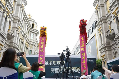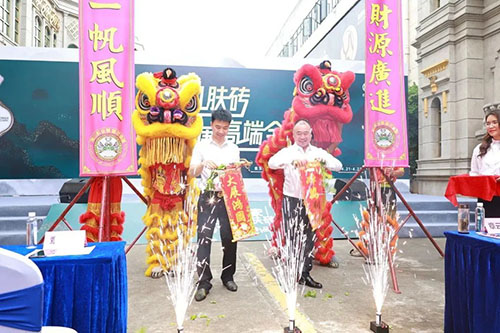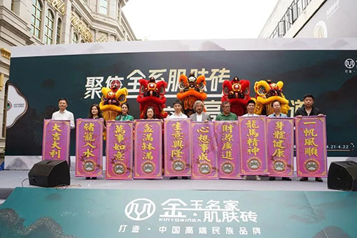 聲聲炮聲震云霄,禮花四濺現美好,醒獅點睛與采青表演的禮成,標志著金玉名家肌膚磚展廳全新形象的正式落地,開啟了金玉名家肌膚磚在奮進市場的全新篇章。